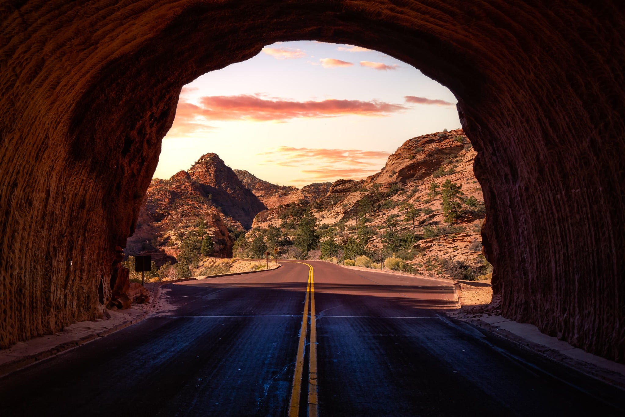 De laatste kilometers naar Zion zijn spectaculair. Via de Zion-Mount Carmel Highway rijd je door een lange tunnel waarna je plotseling wordt omringd door enorme zandstenen rotswanden. Hier begint de Zion Canyon.