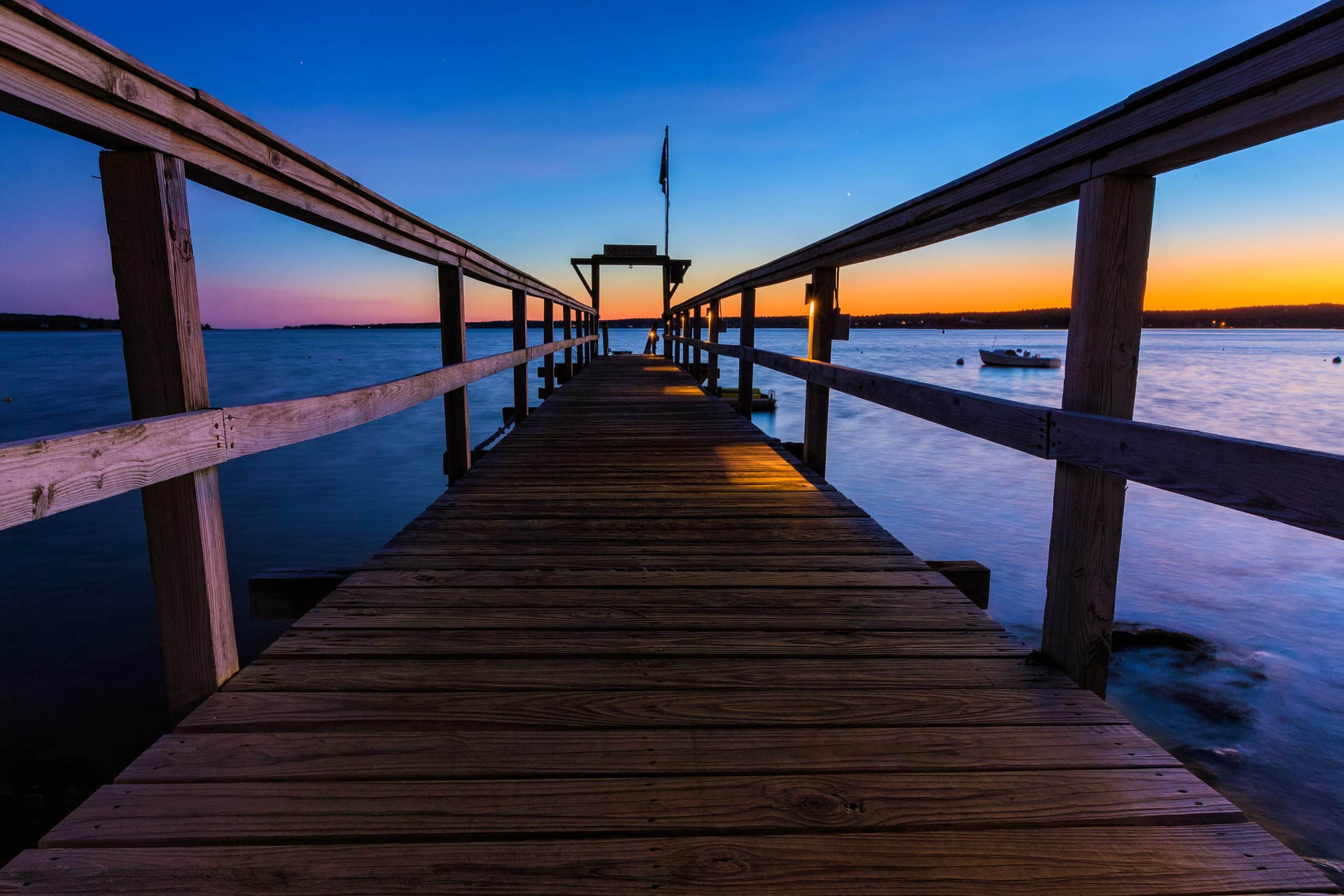 Deze houten brug verbindt beide zijden van Boothbay Harbor. Je hebt er perfect zicht op de schepen en de ondergaande zon.