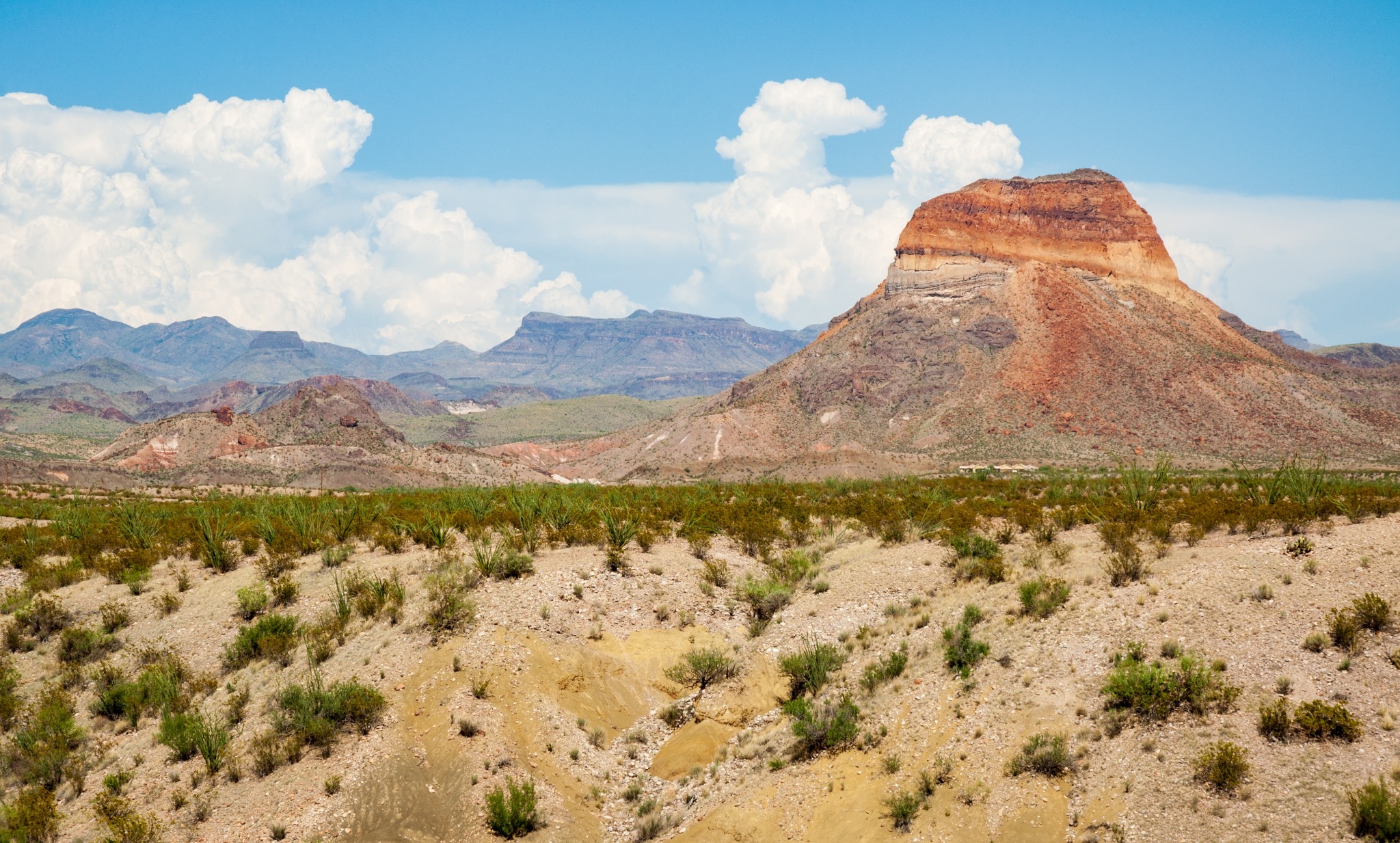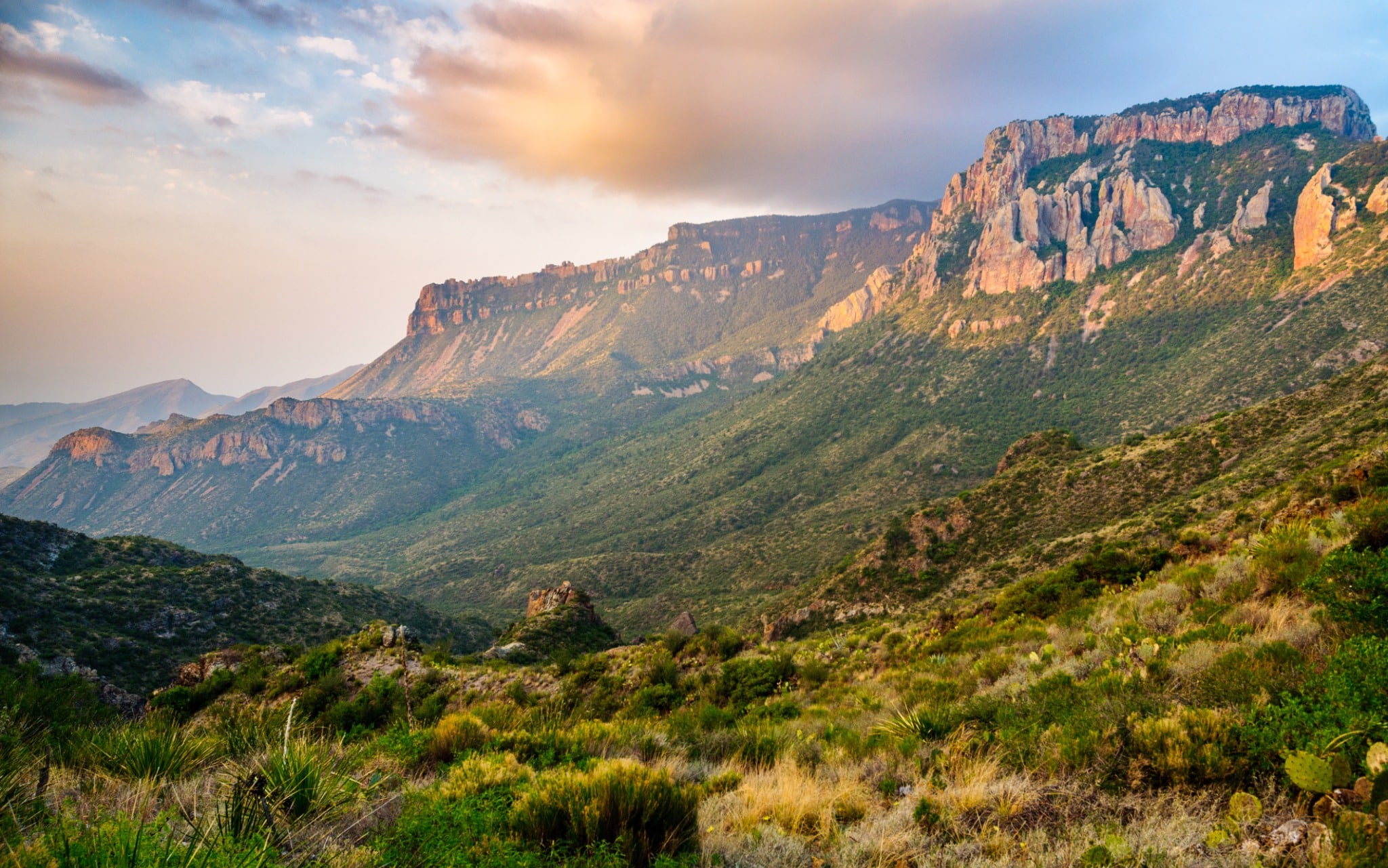 De woestijnvlaktes domineren het grootste deel van het park. Hier vind je cactussen, yucca’s en agaves die in het voorjaar in bloei staan. In de zomer kan de temperatuur in deze delen oplopen tot boven de 40 °C, terwijl de berggebieden koeler blijven. De Chisos Mountains, met als hoogste punt Emory Peak (2.385 meter), bieden wandelroutes met panoramische uitzichten, bossen van eiken en dennen, en kans op het spotten van zwarte beren of bergleeuwen.