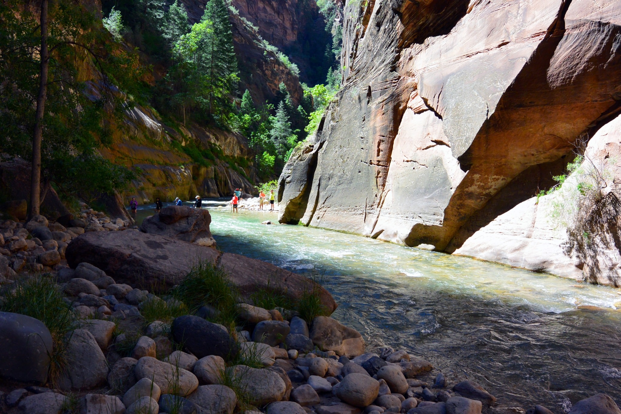 Minstens zo bijzonder, maar op een heel andere manier, is The Narrows. Hier loop je letterlijk ín de rivier, tussen torenhoge canyonwanden die je volledig omringen. Waterdichte schoenen zijn aan te raden – en een camera, want het lichtspel op de muren is ongeëvenaard.